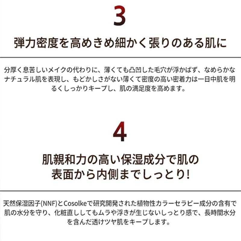 水、シクロペンタシロキサン、酸化チタン、メトキシケイヒ酸エチルヘキシル、PG、メチルプロパンジオール、BG、セチルPEG/PPG-10/1ジメチコン、ナイアシンアミド、メチレンビスベンゾトリアゾリルテトラメチルブチルフェノール、イソノナン酸エチルヘキシル、ジメチコン、合成フルオロフロゴパイト、メドウフォーム油、フェニルトリメチコン、水添ポリ(C6-14オレフィン)、酸化亜鉛、酸化鉄、硫酸Mg、ジステアルジモニウムヘクトライト、メタクリル酸メチルクロスポリマー、カプリリルジメチコンエトキシグルコシド、ポリメチルシルセスキオキサン、アロエベラ液汁、ジメチコンクロスポリマー、デシルグルコシド、1,2-ヘキサンジオール、カプリリルグリコール、水酸化Al、トリエトキシカプリリルシラン、(ジメチコン/ビニルジメチコン)クロスポリマー、レシチン、ベタイン、アラントイン、ヒト脂肪細胞順化培養液エキス、合成遺伝子組換オリゴペプチド-91ボツリヌス菌ポリペプチド-1、ヒト遺伝子組換オリゴペプチド-1、ヒト遺伝子組換ポリペプチド-1、ヒト遺伝子組換ポリペプチド-2、アセチルヘキサペプチド-8、トリペプチド-1銅、グリセリン、カプリルヒドロキサム酸、アデノシン、ポリソルベート20、EDTA-2Na、(アクリレーツ/アクリル酸トリデシル/メタクリル酸トリエトキシシリルプロピル/メタクリル酸ジメチコン)コポリマー、キサンタンガム、スクワラン、リン脂質、フィトステロールズ、フィトスフィンゴシン、セラミドNP、ジャガイモ果肉エキス、ウコン根エキス、サツマイモ根エキス、ウンシュウミカン果皮エキス、ツルニンジン根エキス、マンゴー果実エキス、ショウガ根エキス、マツタケエキス、キャベツ葉エキス、レンギョウ果実エキス、トウモロコシエキス、ハトムギ種子エキス、オタネニンジン根エキス、ペポカボチャ果実エキス、スズランエキス、ハス花エキス、セイヨウアカマツ花芽エキス、チャ葉エキス、ウメ果実エキス、ブロッコリーエキス、オプンチアフィクスインジカ茎エキス、ヘチマ果実エキス、ヨモギ葉エキス、オリーブ果実エキス、キウイエキス、クランベリー果実エキス、ルイボスエキス、マンゴスチン果皮エキス、ボタンエキス、アカツメクサ花エキス、サンシュユ果実エキス、セージ葉エキス、トマト果実エキス、ハイビスカス花エキス、フェノキシエタノール、ビオサッカリドガム-1、アスコルビルリン酸Na、クエン酸、ソルビン酸K、安息香酸Na、香料、シトロネロール
